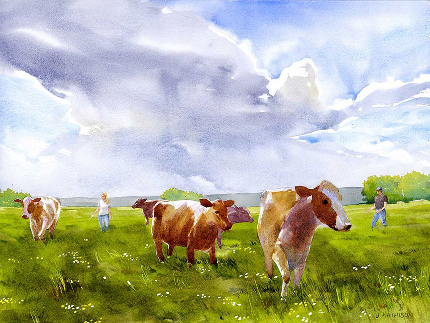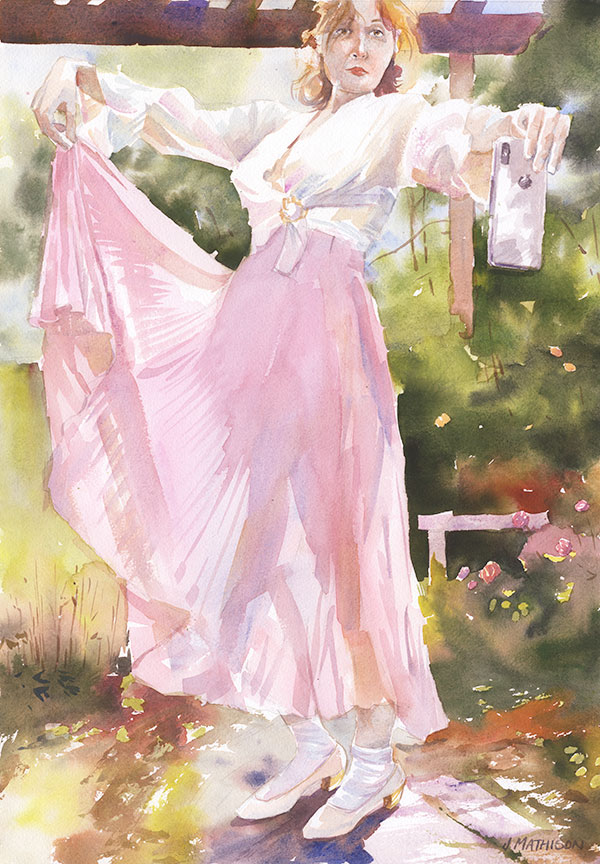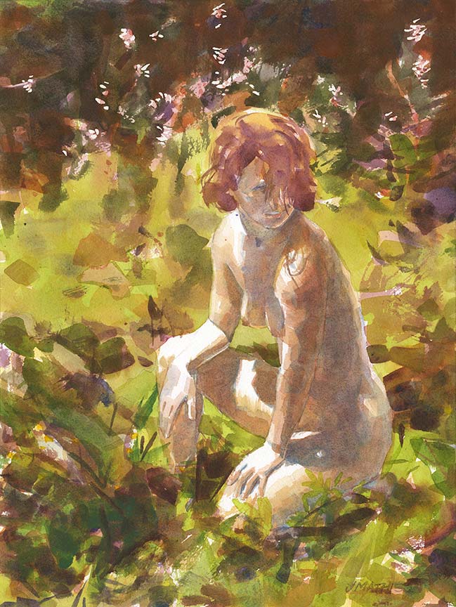 Watercolor! I love the way it flows on the paper, with a mind of its own. My best paintings combine my skill in controlling the paint, with the happy accident of colors mixing freely. My focus is on the human figure, often placed in harmony with natural settings. I also paint landscapes to capture fleeting moments of light. Here I'm sharing a selection of my notable images. The Figure Art and Landscape pages offer many more. The Portfolio page is an introduction to my personal journey through art. Enjoy!